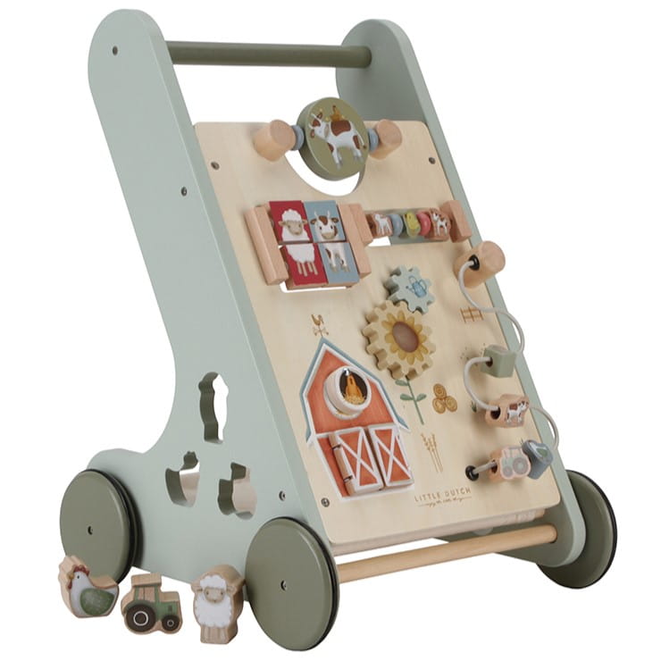 Drewniany chodzik edukacyjny Little Farm FSC od Little Dutch. Solidna konstrukcja sprawia, że chodzik doskonale nadaje się do nauki chodzenia dla dzieci od 12 miesiąca, które gotowe są do stawiania pierwszych kroków. Drewniany wózek-chodzik oferuje mnóstwo ciekawych zabaw, które wspierają rozwój oraz umiejętności motoryczne dzieci. Znajdziemy tu lusterko, które maluchy uwielbiają, przeplatankę do ćwiczenia małych rączek, sorter, dopasowywanie kształtów i wiele innych świetnych zabaw z motywem kolekcji Little Farm. Z tyłu chodzika znajdziemy miejsce na skarby dziecka, klocki czy zabawki, które może swobodnie przewozić. Gumowe kółka zapewniają przede wszystkim stabilność podczas pierwszych kroczków dziecka, dodatkowo dzięki gumie nie zarysują podłogi. Zabawka wykonana jest z drewna z certyfikatem FSC i pokryta farbami na bazie wody. Stanowi świetny pomysł na prezent i doskonałe uzupełnienie dla pozostałych zabawek z kolekcji Little Farm od Little Dutch.